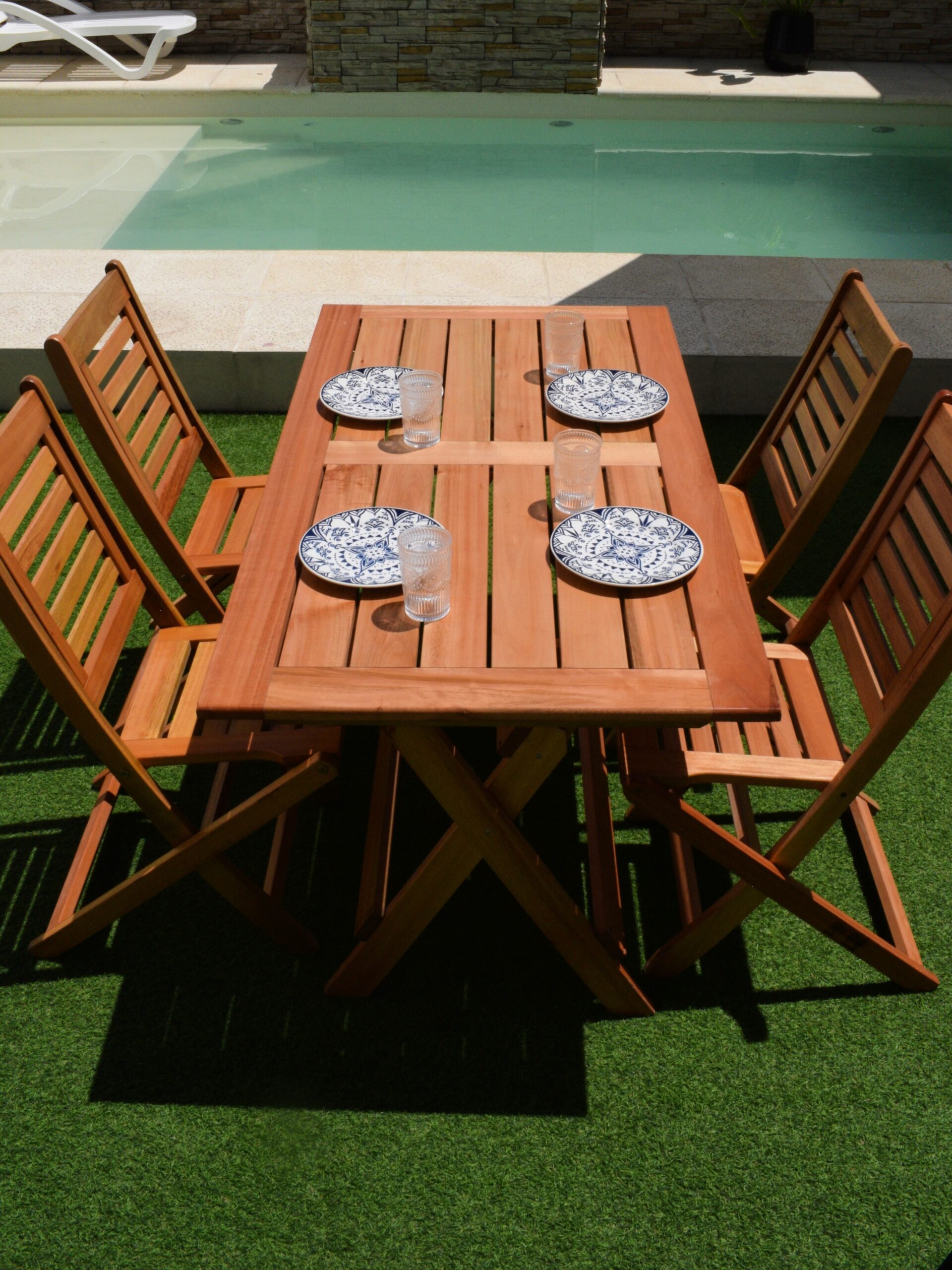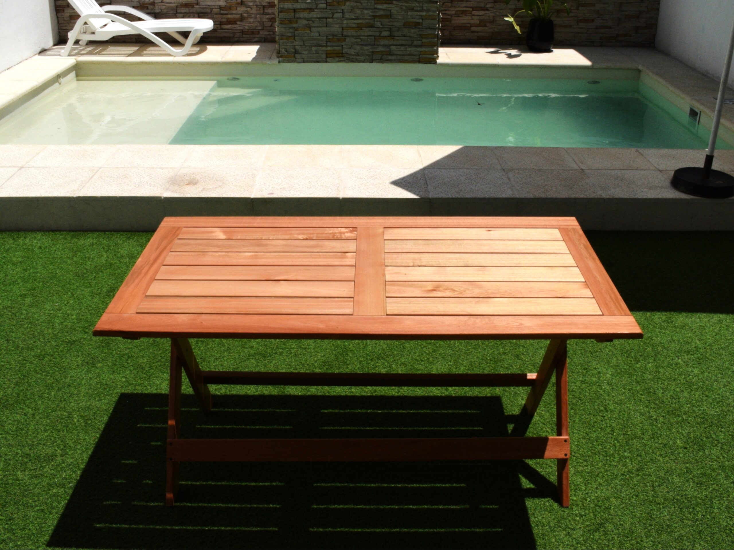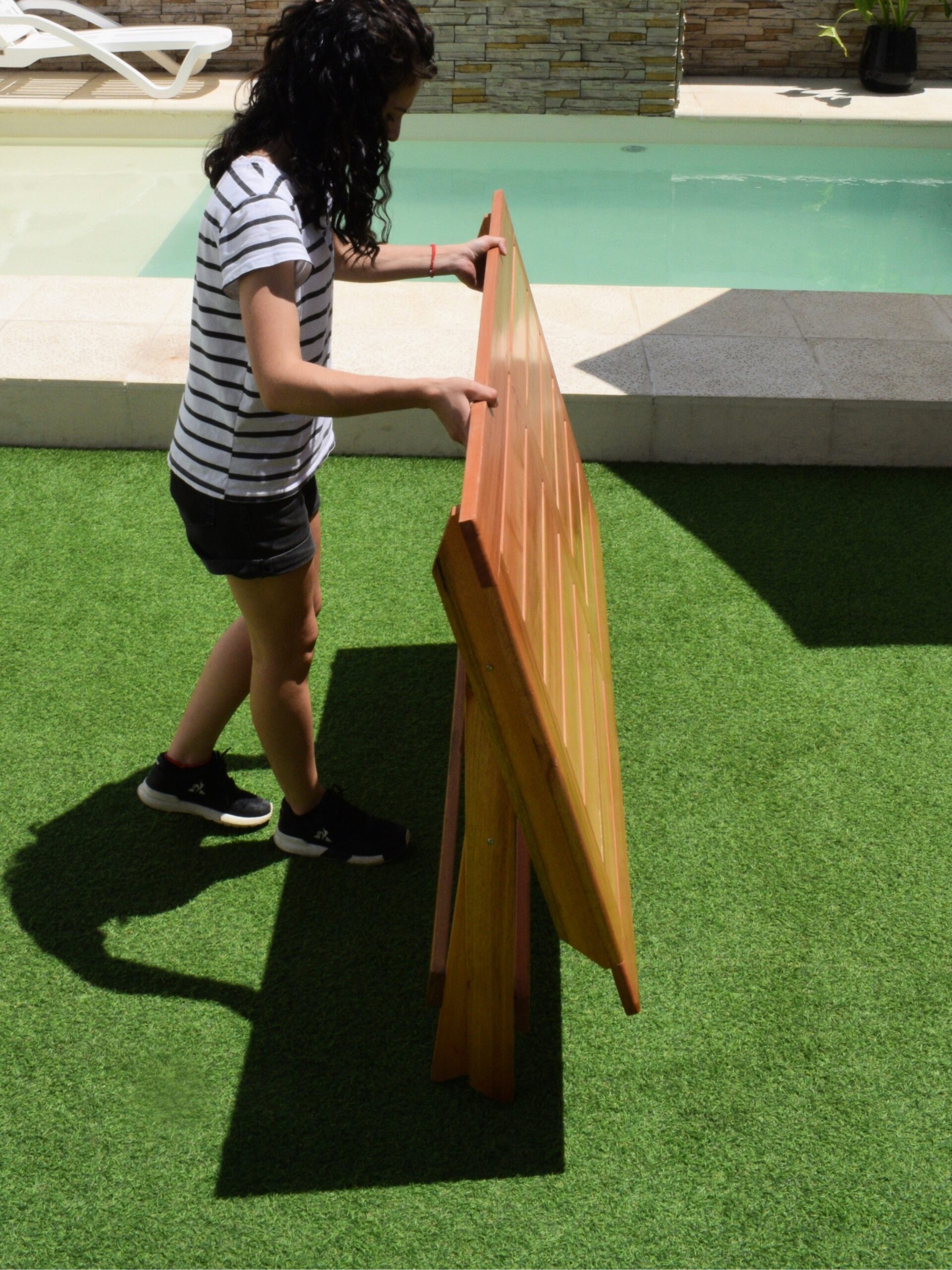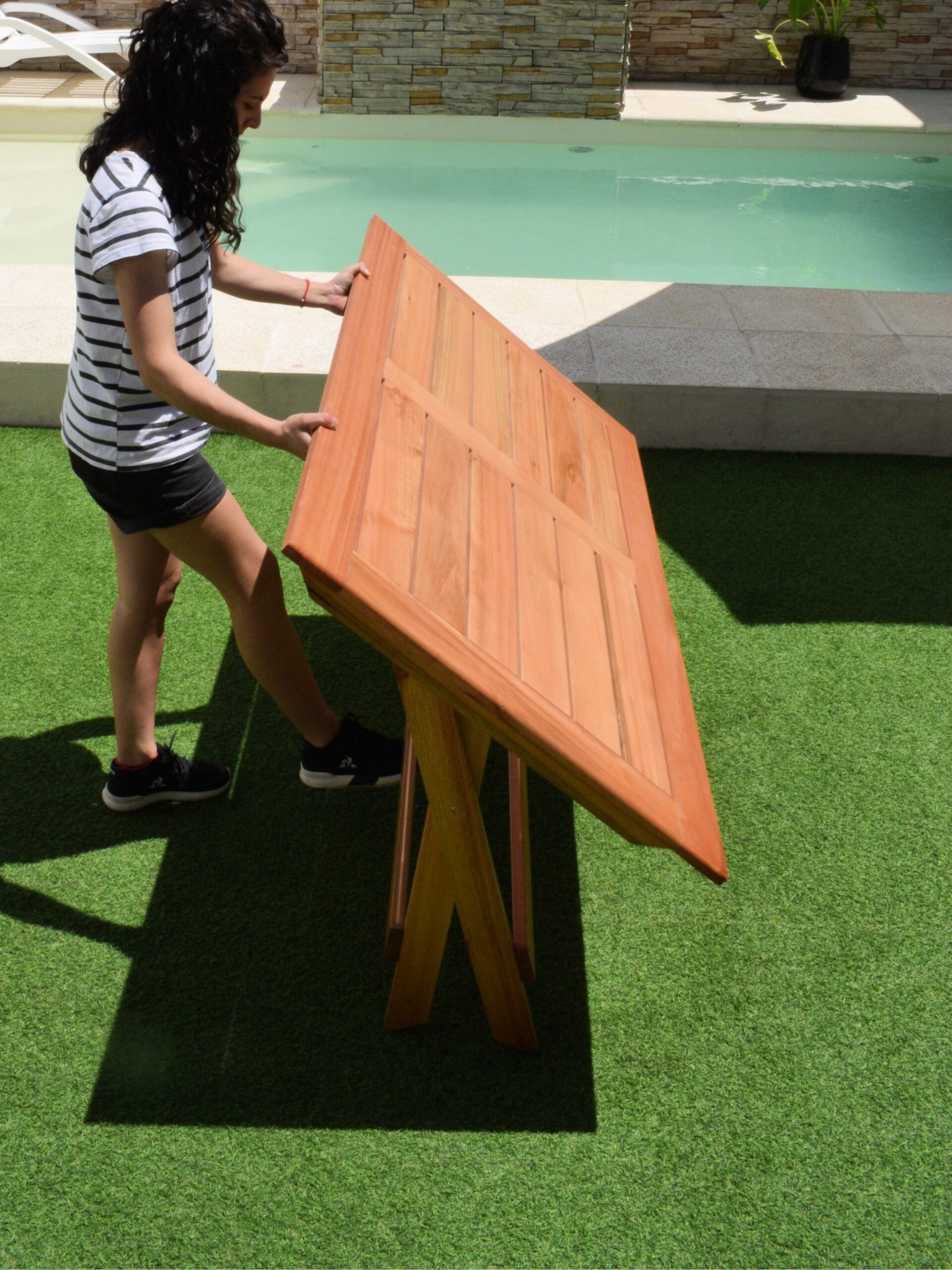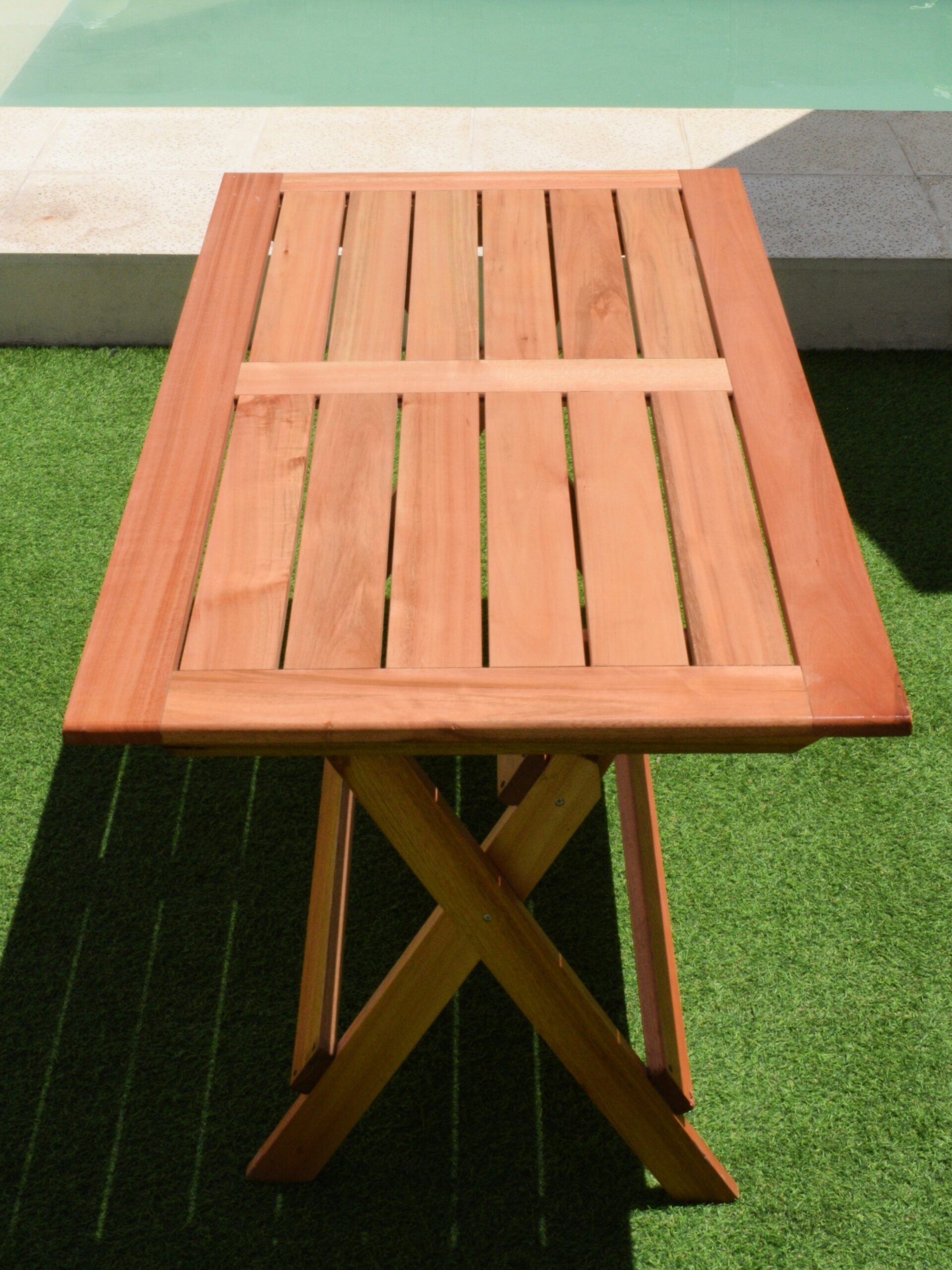 Mesa rectangular 1.50 x 80 cm -Diseño plegable en Eucalipto. Con capacidad para 6 sillas.
