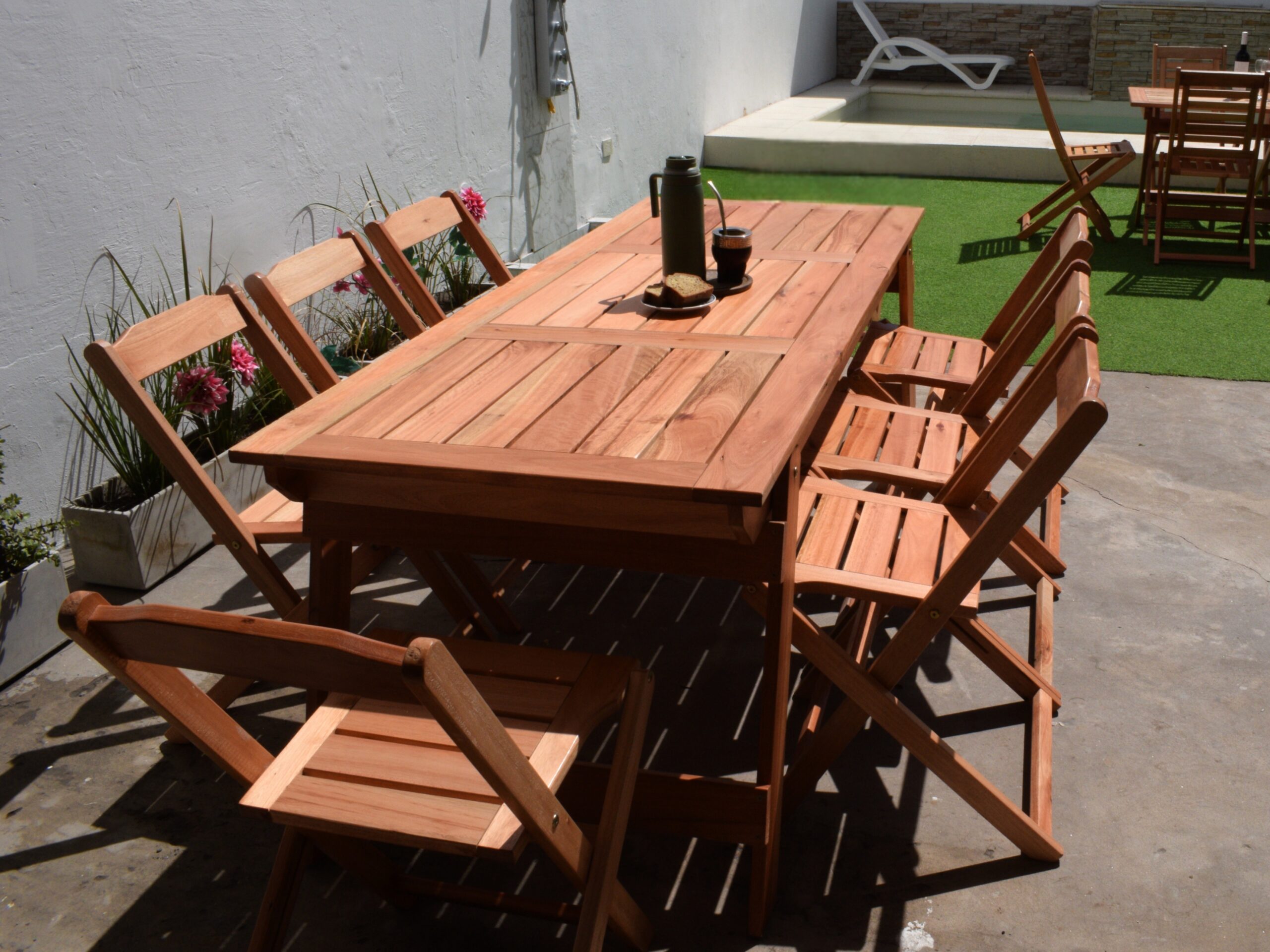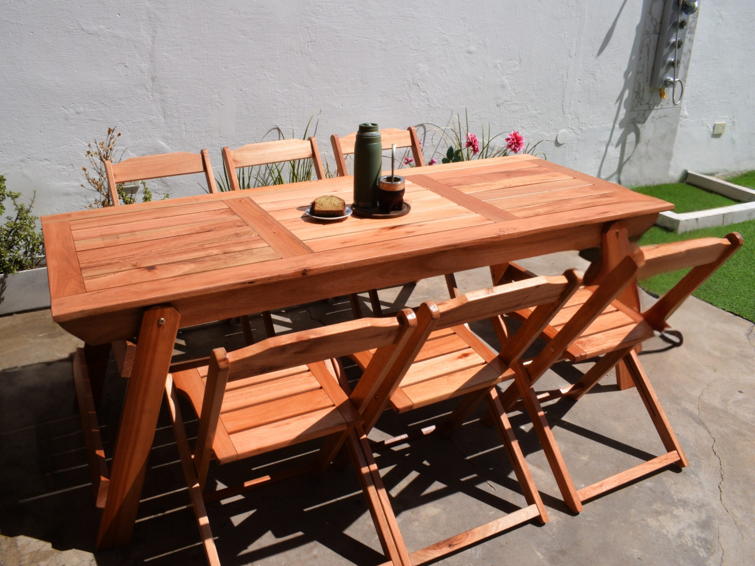 Convertí tu jardín, terraza o patio en un refugio con el Set Refugio /6, compuesto por una mesa rectangular plegable de 2.10 x 80 cm con patas rebatibles y seis (6) sillas Refugio plegables. Este set está pensado para quienes valoran el diseño vintage y el confort en comunidad.