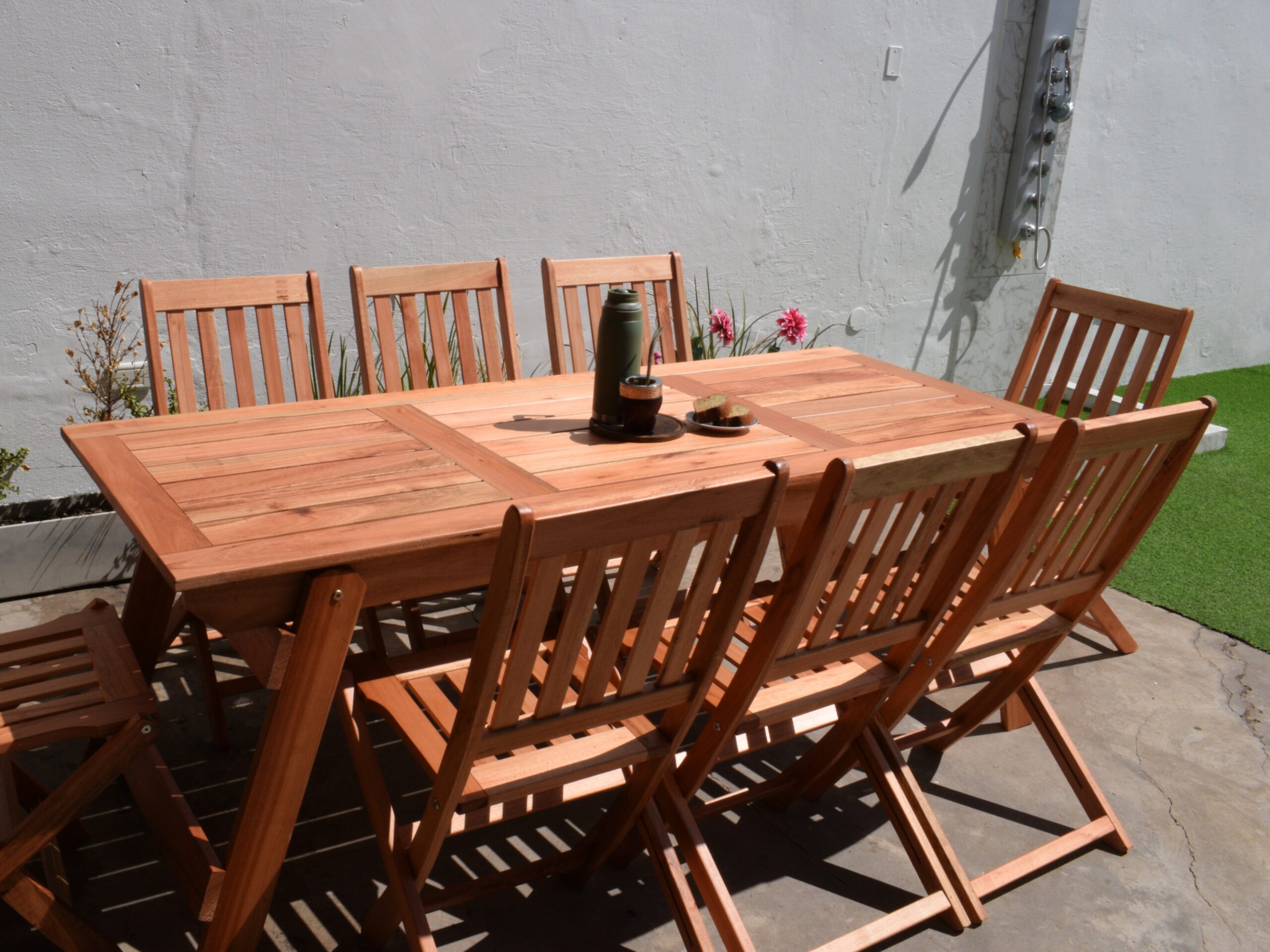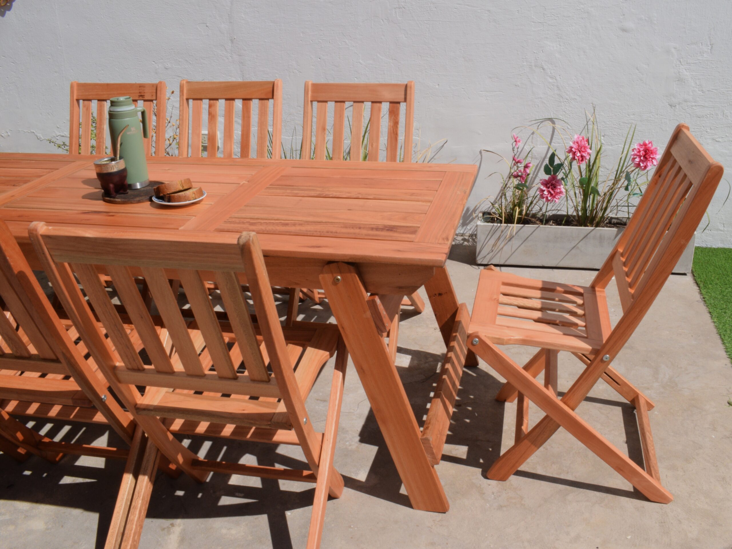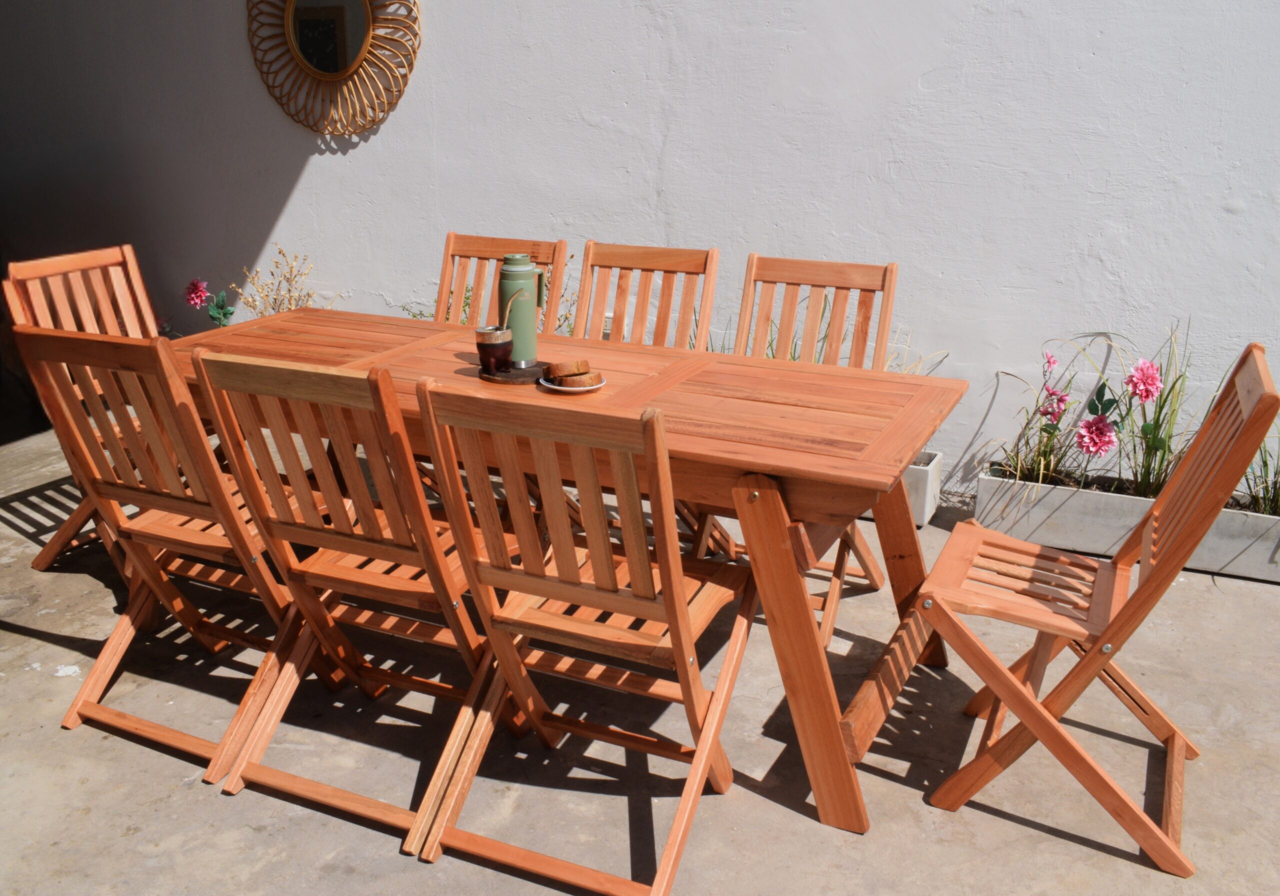 Set Refugio Clásico. Diseño atemporal en Eucalipto. Una mesa rectangular de 2.10 x 80 y ocho sillas plegables Clásicas.